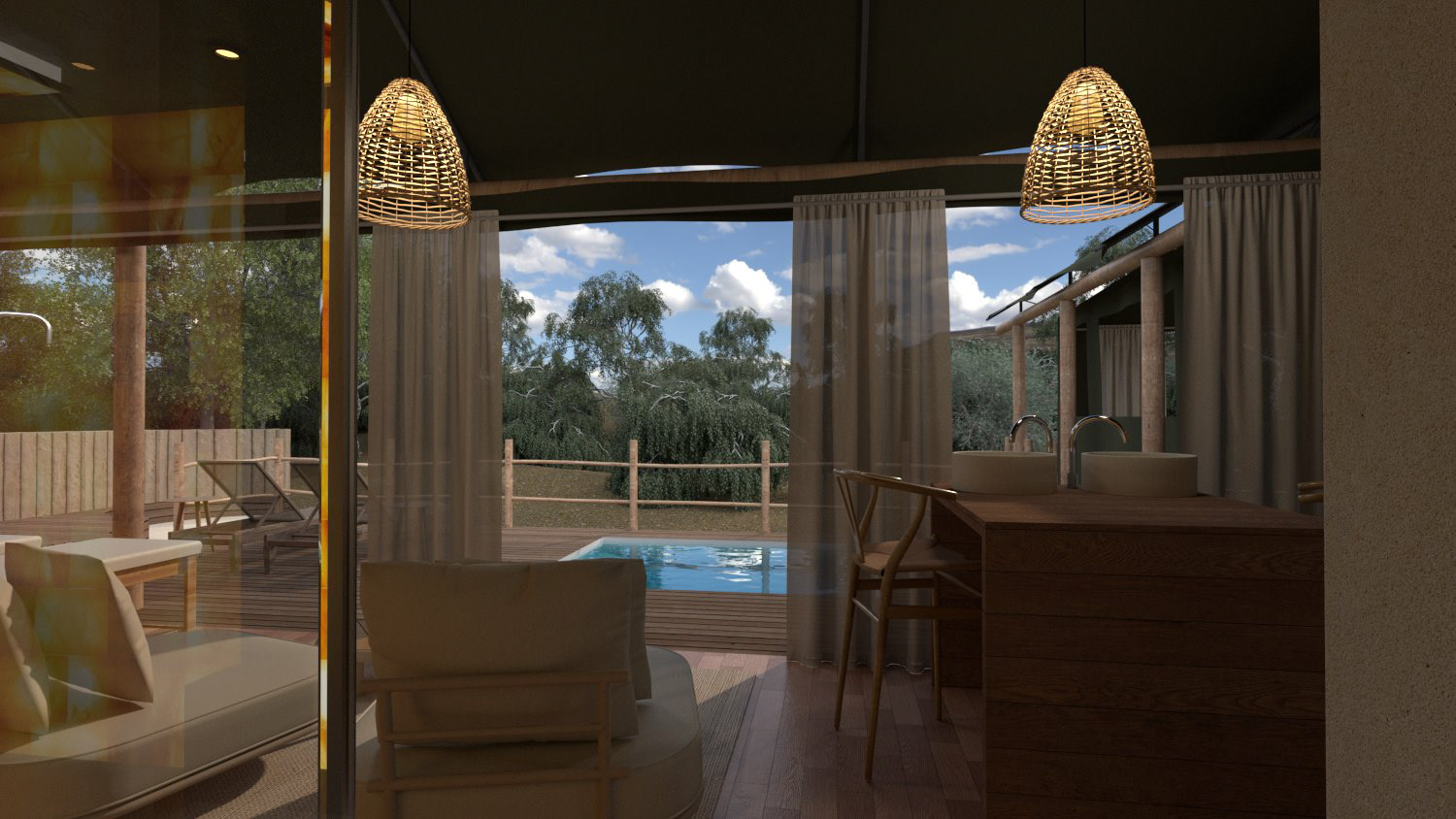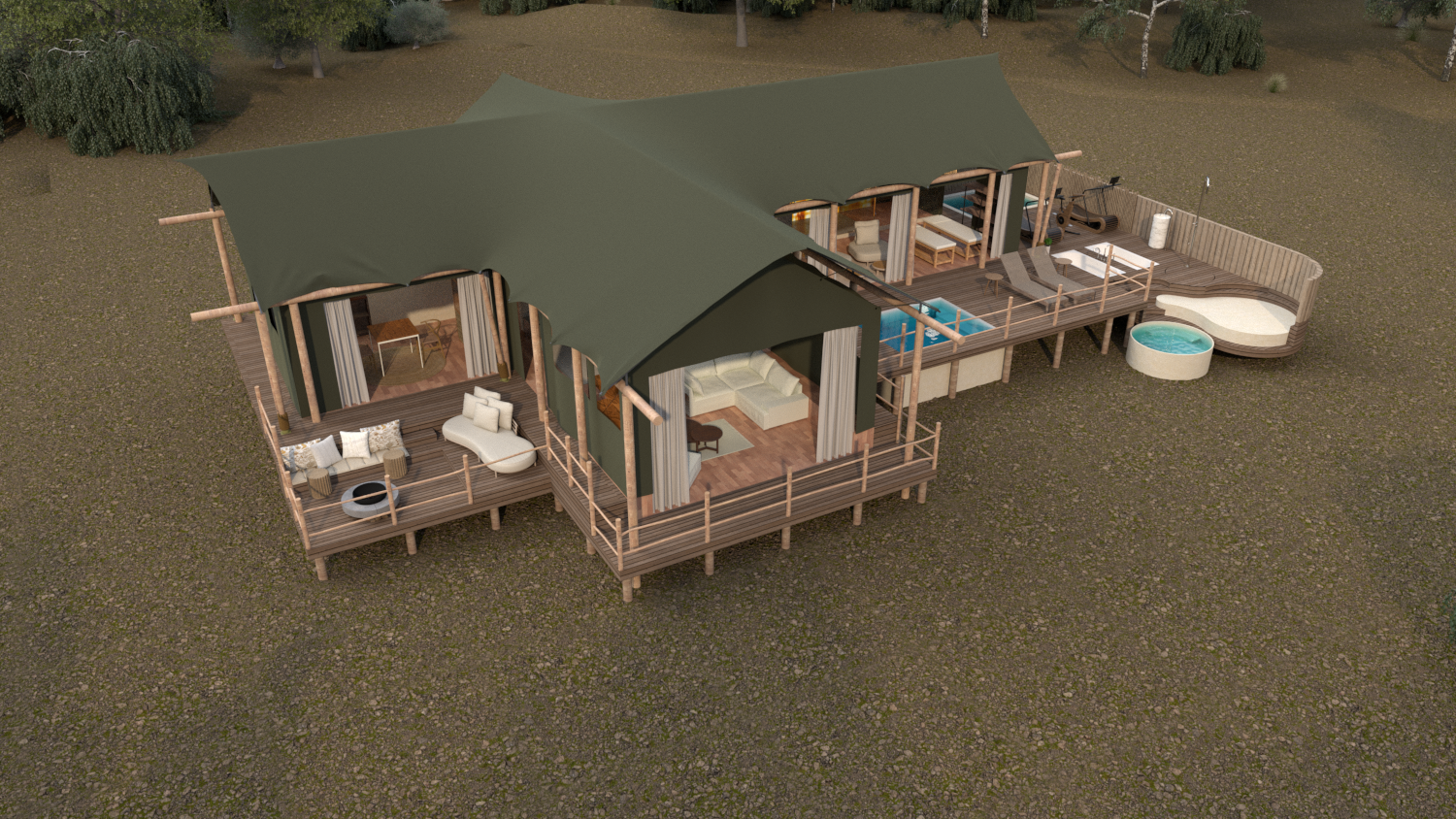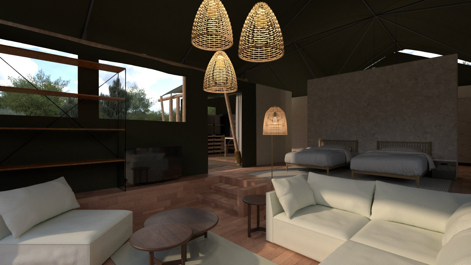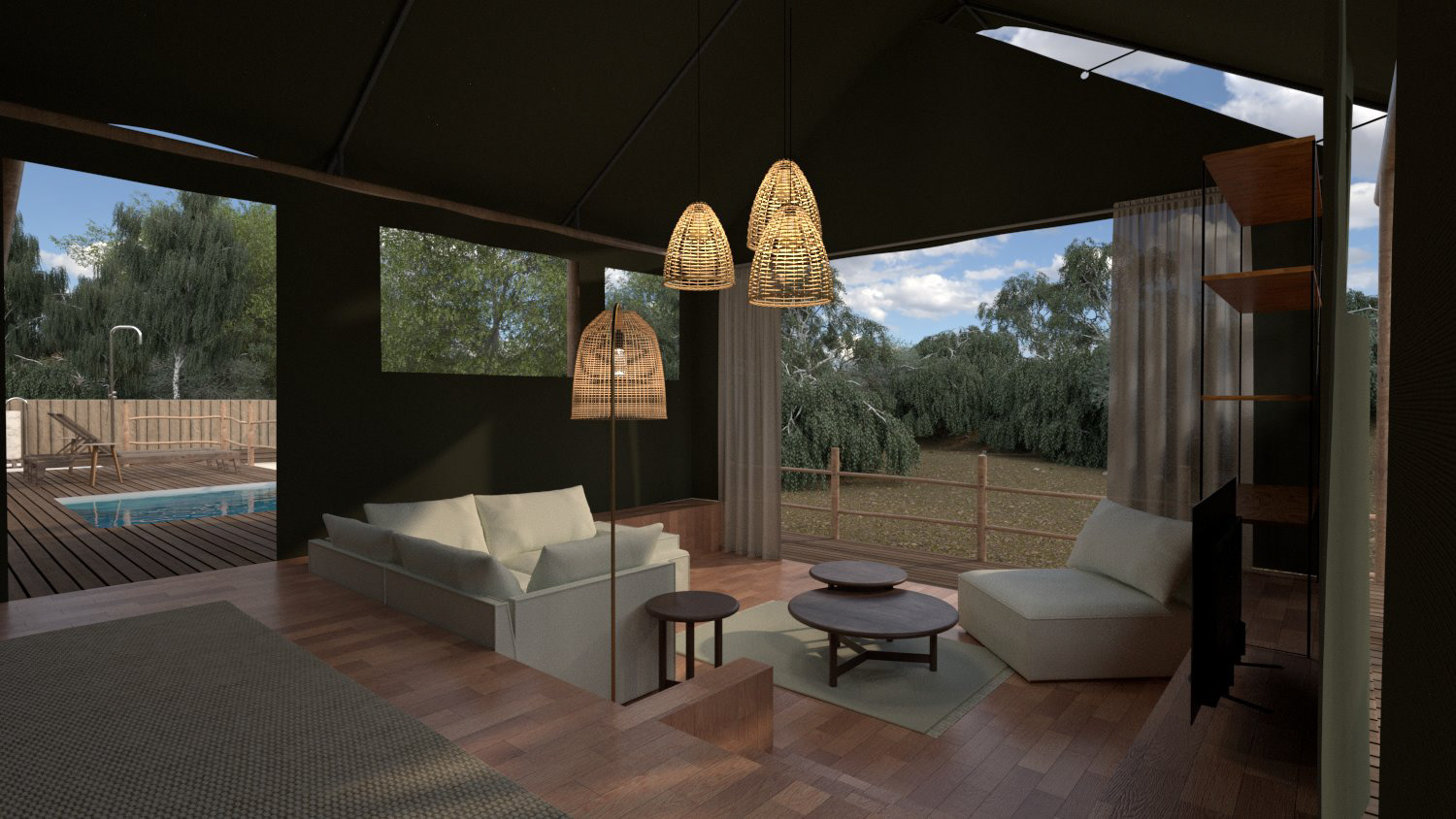 This luxury safari lodge project was developed for an eco-conscious resort in the heart of South Africa’s wilderness, aiming to provide a premium nature escape without compromising on design or comfort. The architectural form takes inspiration from African safari tent traditions, upgraded with modern hospitality features like ensuite spas, outdoor baths, glass facades, and open-air relaxation decks. The spatial layout promotes both seclusion and openness, with a focus on natural views and material tactility. Lighting scenarios were crafted to reflect sunset mood and golden hour ambience, ideal for presentation visuals in resort branding, investment pitches, or guest brochures. This visualization offers a holistic representation of eco-luxury living, built with technical precision and artistic storytelling.